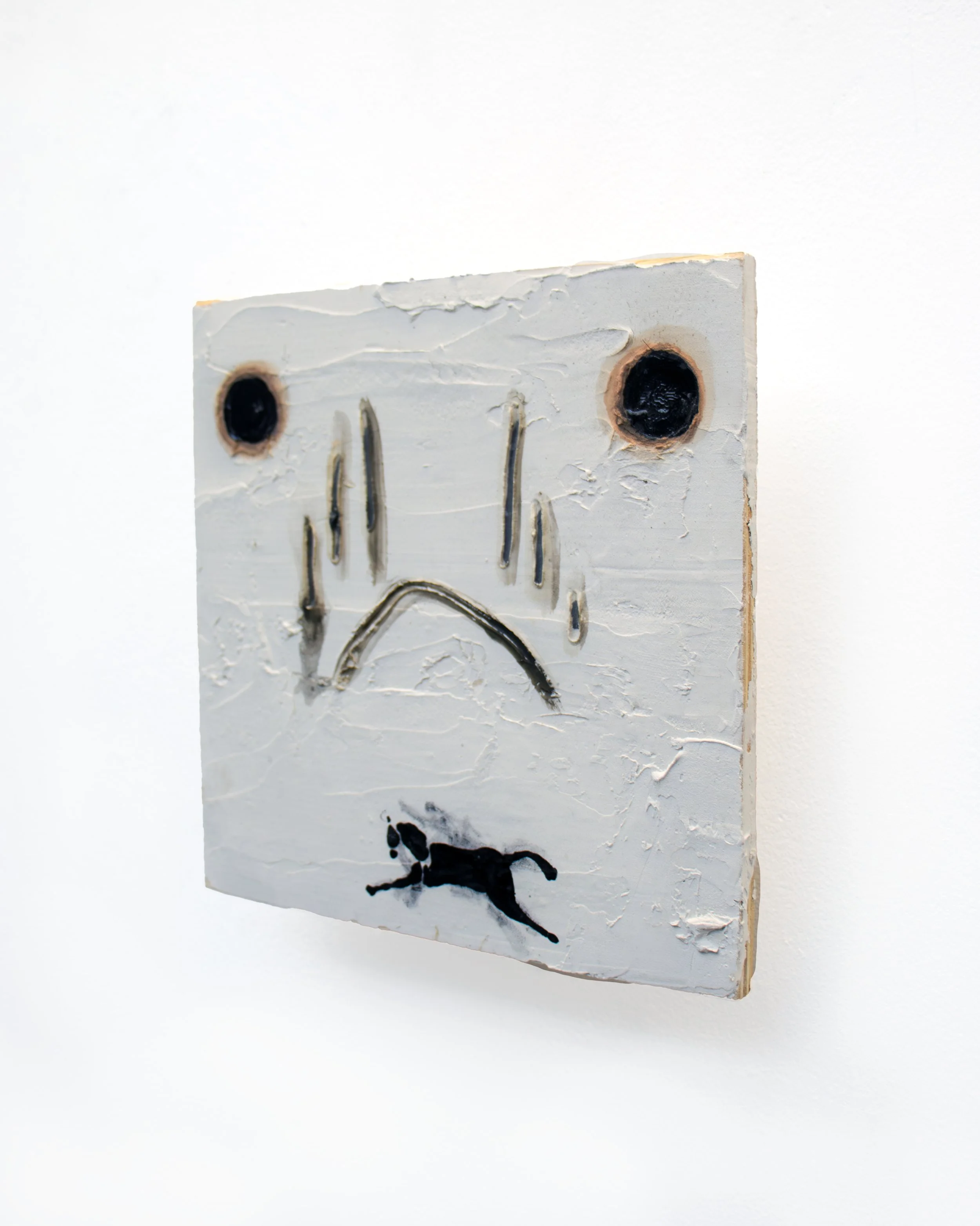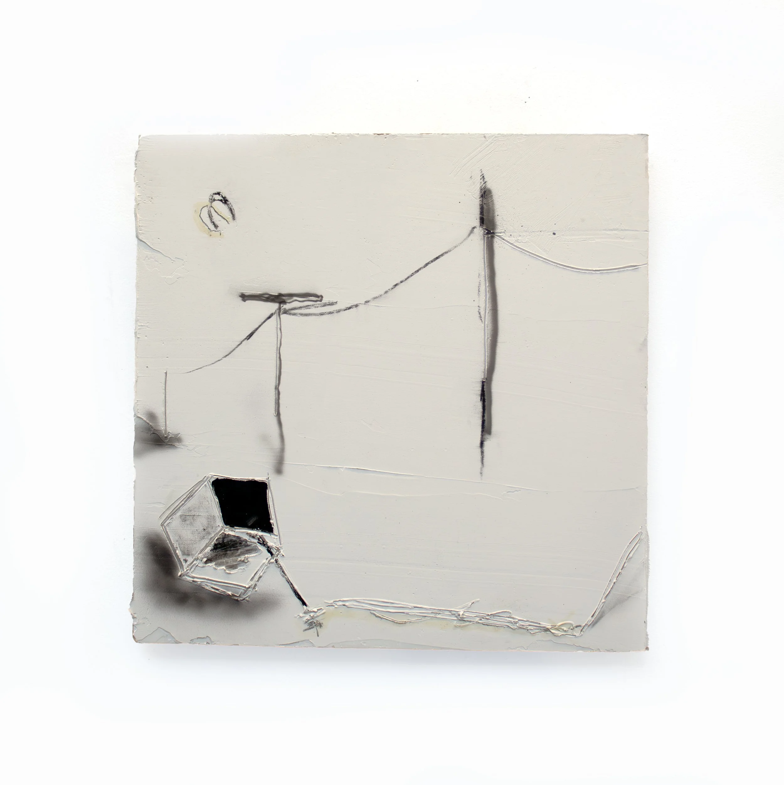 water freezes in the potholes/dead symbols don’t work, 2022, 10” x 10”, oil, enamel, charcoal, and joint compound on panel